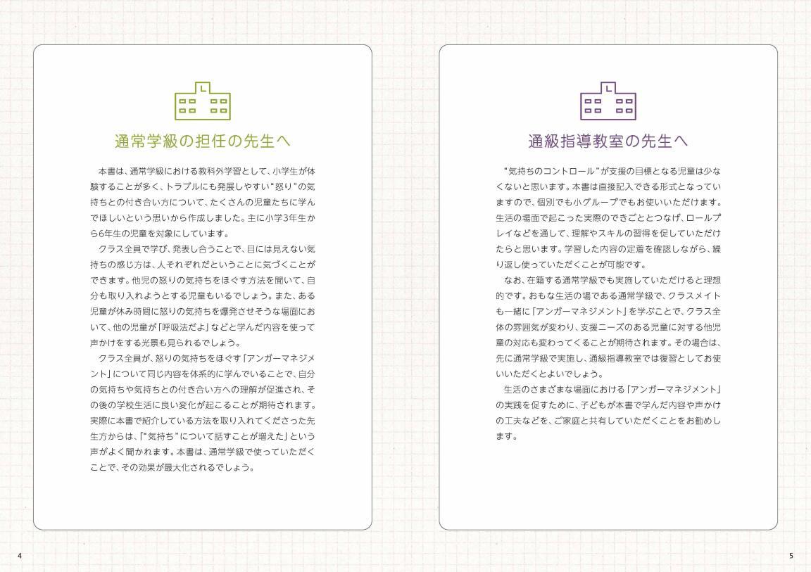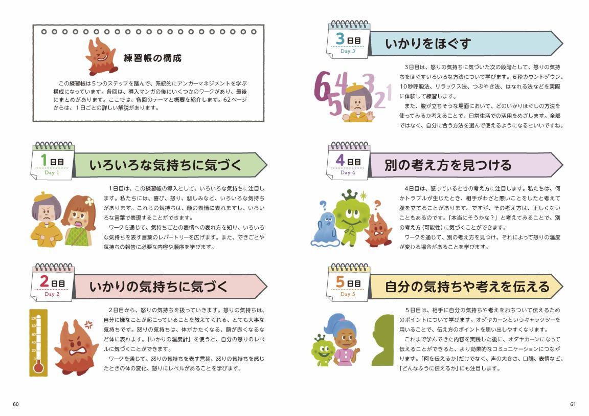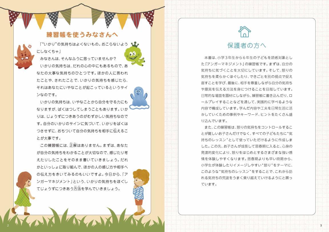前半の書き込み式の「練習帳」は、二次元コードからダウンロードをして必要なだけ児童に配布でき、繰り返し使える。また、「練習帳」は、全国の協力校で実践され一定の効果が示されたプログラムをベースにしたものであり、本書は「解説」を加えてより広い需要に応えるために市販化を実現した。「解説」は、サポートする保護者や教員に向けた内容で、学習指導案も付いている。本書では、怒らないことを目指すのではなく、まずは、自分の気持ち(喜怒哀楽)に気づいて理解すること、つぎに怒りの気持ちをほぐしたり、できごとを別の視点で捉え直すこと、最後に相手を尊重しながら自分の気持ちや意見を伝えることを目指している。
