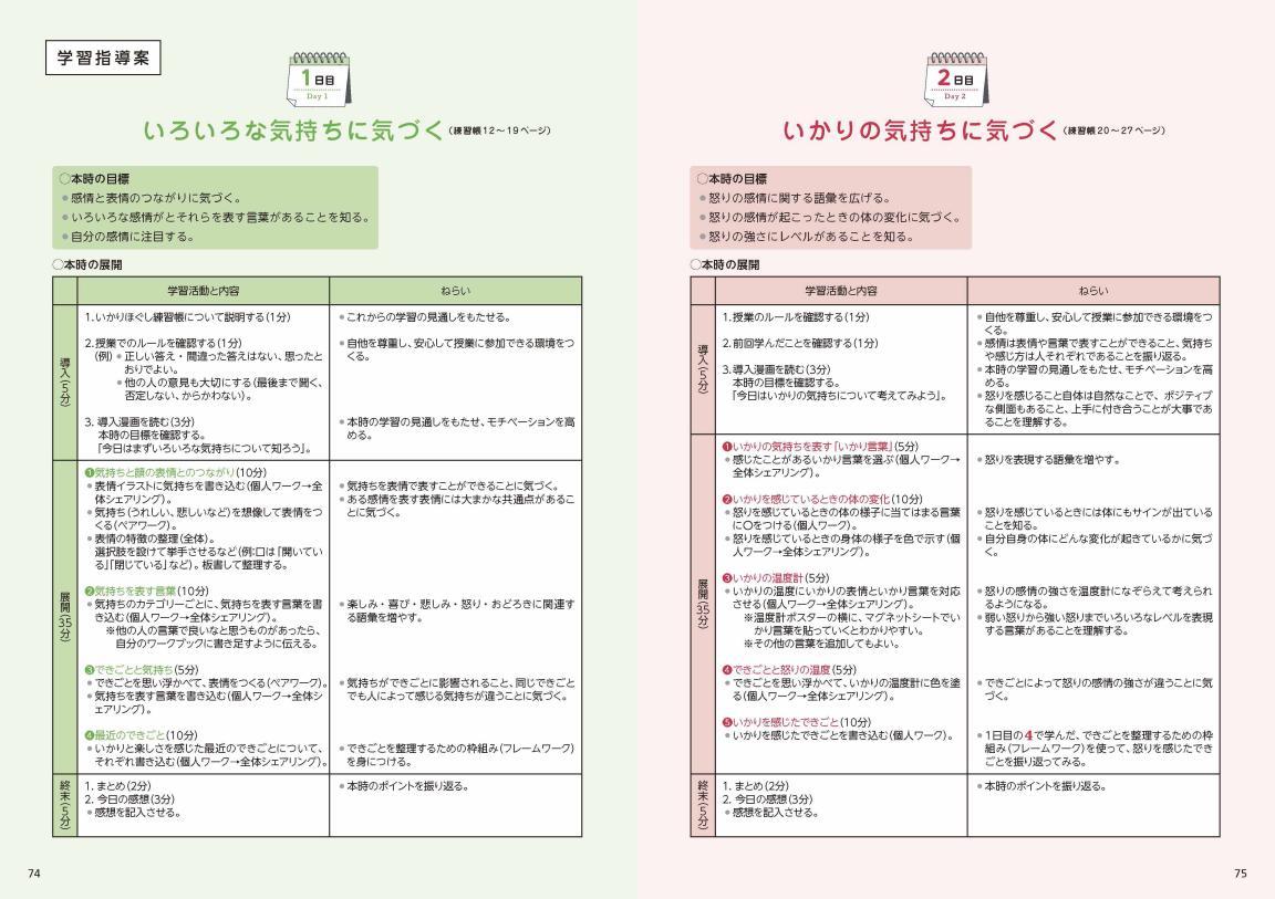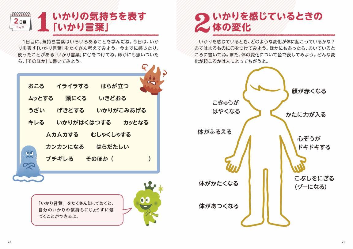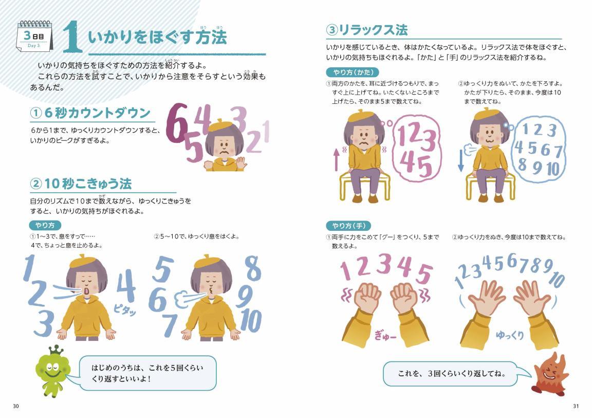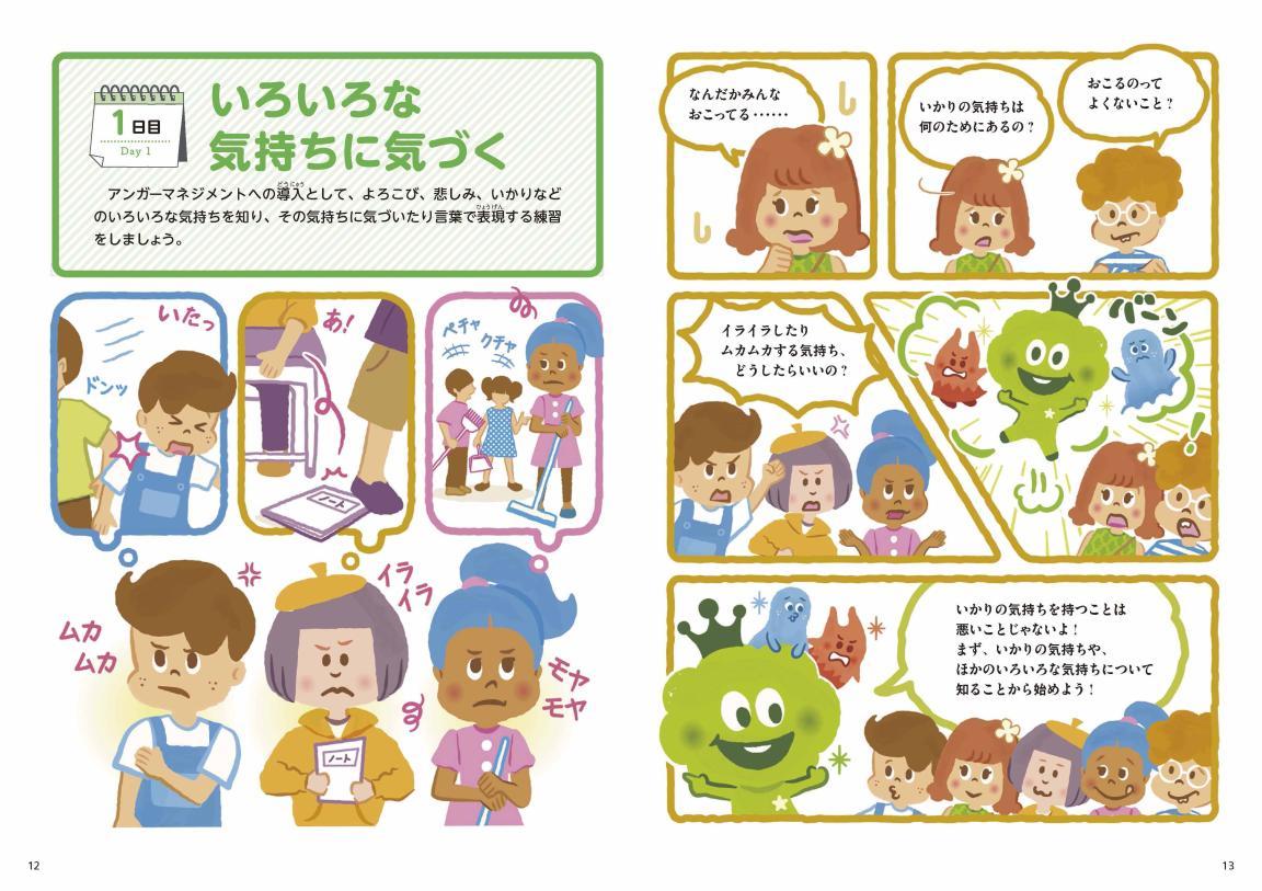 前半の書き込み式の「練習帳」は、二次元コードからダウンロードをして必要なだけ児童に配布でき、繰り返し使える。また、「練習帳」は、全国の協力校で実践され一定の効果が示されたプログラムをベースにしたものであり、本書は「解説」を加えてより広い需要に応えるために市販化を実現した。「解説」は、サポートする保護者や教員に向けた内容で、学習指導案も付いている。本書では、怒らないことを目指すのではなく、まずは、自分の気持ち(喜怒哀楽)に気づいて理解すること、つぎに怒りの気持ちをほぐしたり、できごとを別の視点で捉え直すこと、最後に相手を尊重しながら自分の気持ちや意見を伝えることを目指している。