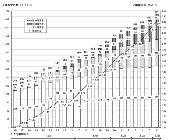 法定雇用率の引き上げとともに、働く障害者は年々増加し、およそ67.7万人(2024年度)と過去最高を更新しています。