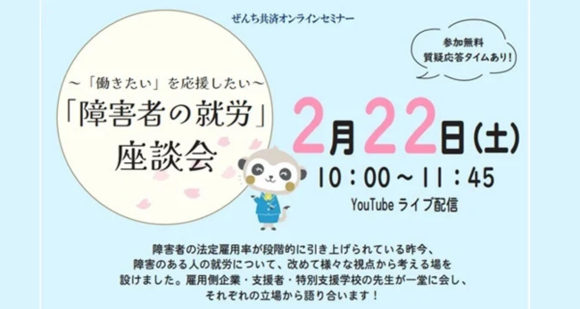 障害者向けの保険を取り扱う専門保険会社、ぜんち共済株式会社(本社:東京都千代田区、代表取締役社長:榎本重秋)は、2025年2月22日(土)に障害者の就労をテーマにしたオンラインセミナーを開催いたします。