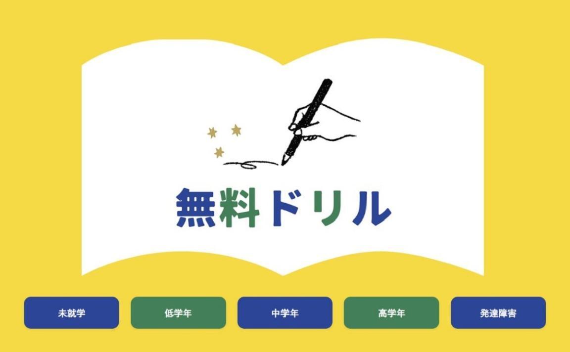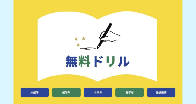 ▲「HugKum 無料ドリル」のトップ画面。上から未就学・低学年・中学年・高学年・発達障害向けと並びます。
