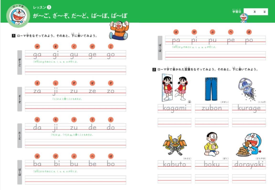 『ドラえもんはじめての英語ドリル アルファベット・フォニックス・ローマ字』は、《パート1》アルファベット(書き方と読み方)、《パート2》フォニックス(アルファベットの音のルール)、《パート3》ローマ字(書く練習)を音声とともに学べるドリル。この無料ダウンロード版ではパート3の一部を体験できます(音声は含みません)。