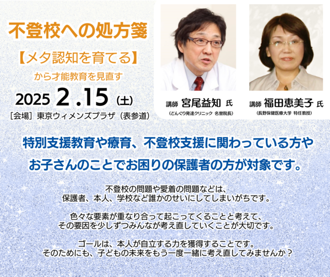 講師に「どんぐり発達クリニック」名誉院長 宮尾益知氏(児童精神科医)、長野保健医療大学 特任教授 福田恵美子(作業療法士・相談支援専門員)氏を迎え、「メタ認知を育てる」という観点から才能教育と不登校対応についてご講演をいただきます。
