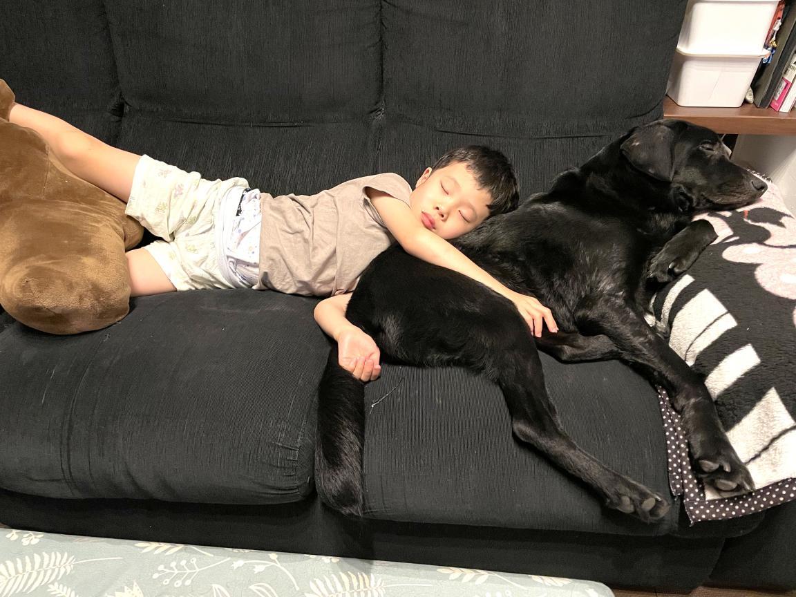 家では息子さんがアーモにお水をあげたり、オモチャで遊んだり、一緒に寝たりと仲むつまじい二人です。発語や感情表現にあまり変化はありませんが、家族みんなで笑う時間は増え、息子さんにとってアーモが「一緒にいると安心できる存在」となっていることは間違いありません。アーモは普段はお母さんにベッタリの甘えん坊ですが、息子さんに対しては寝坊したときには起こしにいったりして、お世話をしているような様子もみられます。