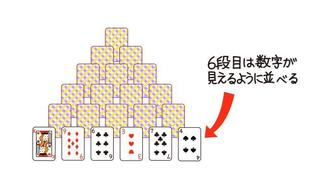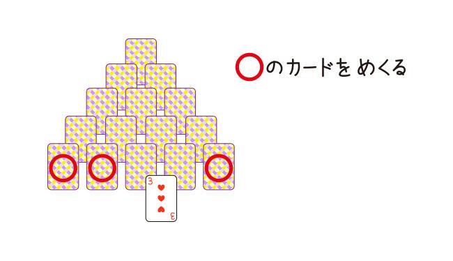 ② 6段目のカードを取ることができなくなったら、6段目のカードが重なっていない5段目のカード(図2の場合、○で示したカード)をめくることができます。