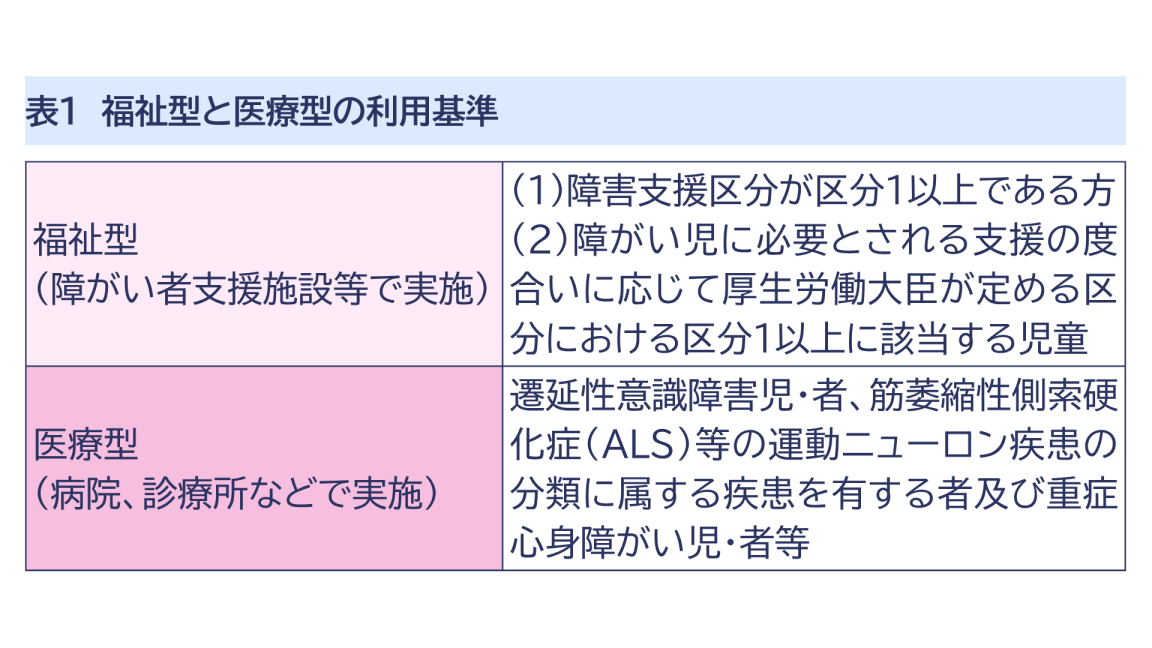 知的、身体、精神、発達障がいの特性を有する子どもについては、このうち主に「福祉型」を利用することになります。ただし、何らかの医療的ケアを必要とする場合については「医療型」のサービスで医療的処置等を受けながら過ごすこととなります。