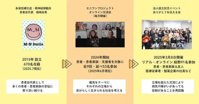 エニワンプロジェクトの代表理事である狐崎友希が、自身が指定難病〈多発性硬化症〉を発症したことにより、2015年に多発性硬化症、視神経脊髄炎患者会 【M-N Smile】を設立しました。