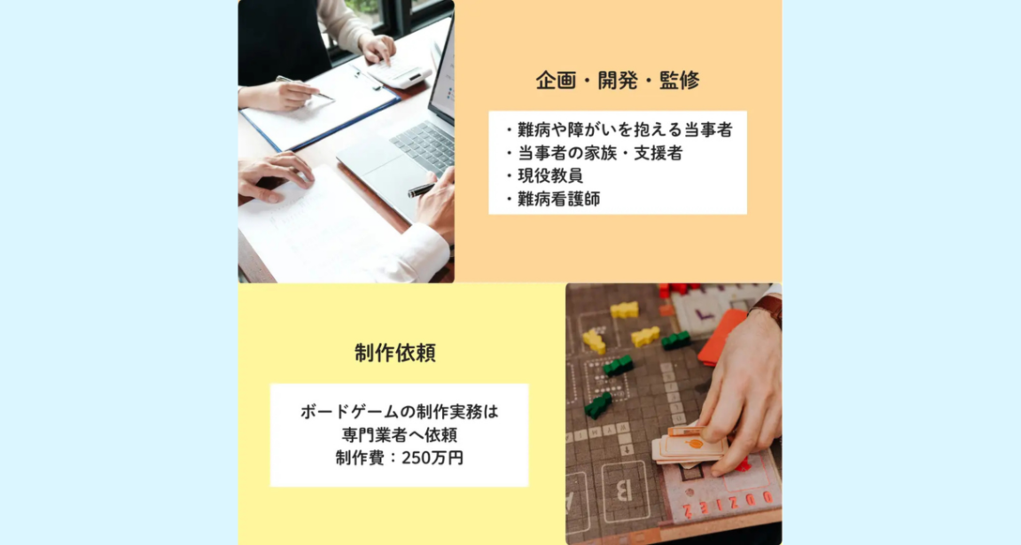また、子どもたちにも受け入れやすいものとして現役教員が、正しい医療知識として難病看護師が監修として参加いたします。その内容をもとに専門業者へ委託し、遊んで楽しいボードゲームを制作します。