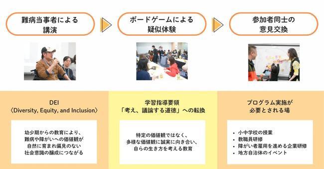難病や障がいのある方やその家族、支援者の声を活かしたボードゲーム教材と講演を組み合わせることにより、正しい知識や理解を子どもも大人も自然に持てる社会を目指します。