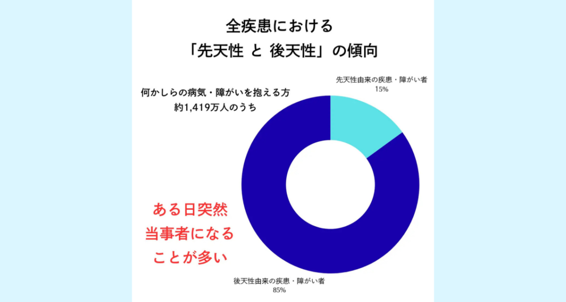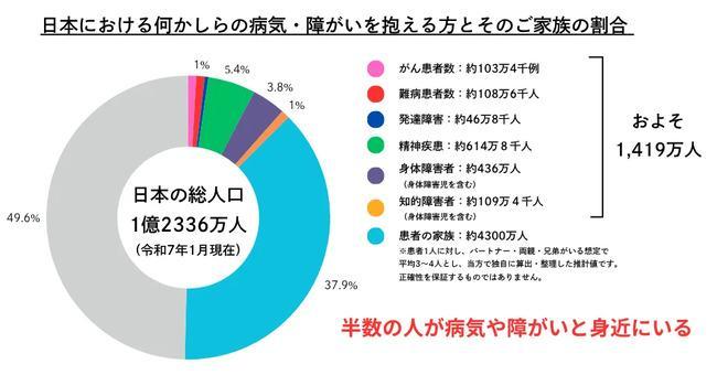 そして、患者1人に対してパートナー・両親・兄弟がいる想定で、家族が平均3〜4人で算出すると、日本に住んでいる人の半数の人が病気や障がいと身近にいることになります。