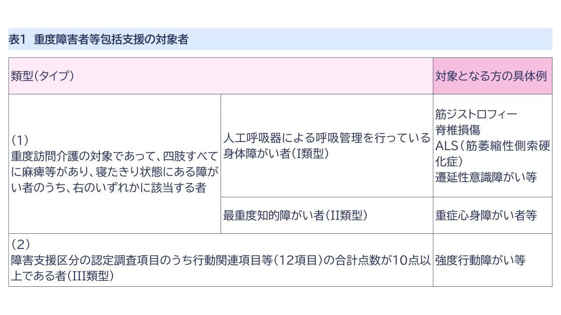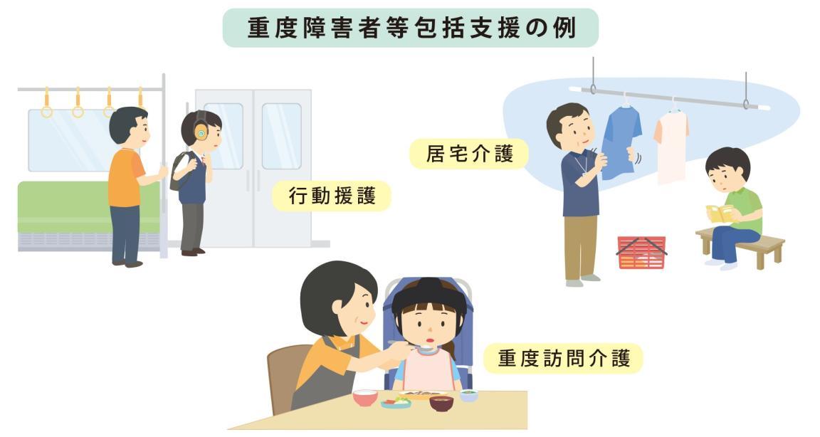 障がいがあり常に介護が必要な方で、意思疎通を図ることに著しい支障がある方か、四肢の麻痺および寝たきりの状態にある方、知的障がいまたは精神障がいによって行動上著しい困難を有する方について、「居宅介護」や「重度訪問介護」、「同行援護」、「行動援護」、「生活介護」、「短期入所」、「自立訓練」、「就労移行支援」、「就労継続支援」、「就労定着支援」、「自立生活援助」および「共同生活援助」を包括的に提供することを「重度障害者等包括支援」といいます。