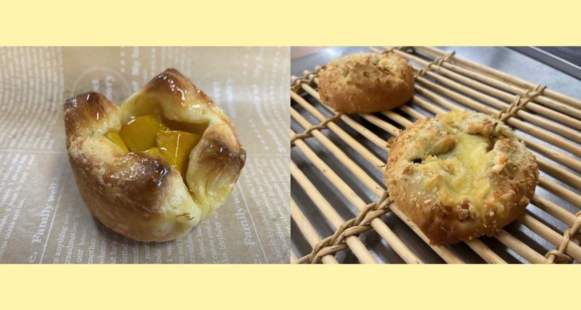 ▲「トロピカルデニッシュ(左)」と「にしよこカレーパン(右)」