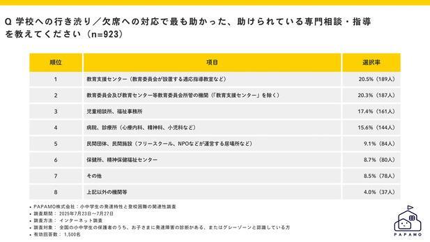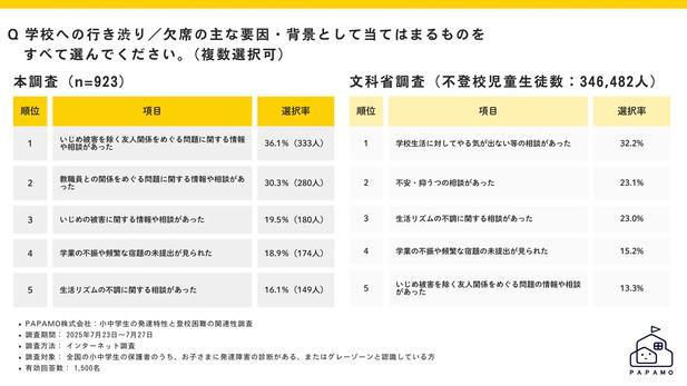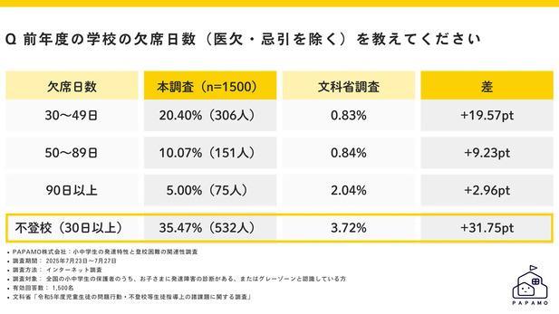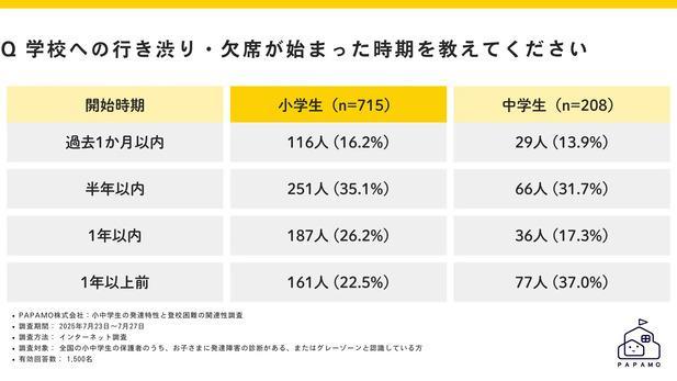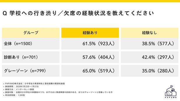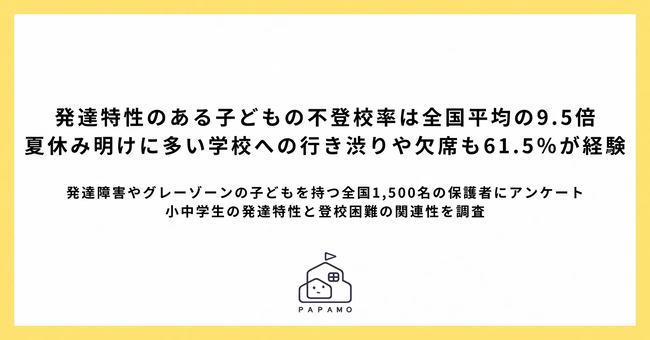 今すぐ・どこにいても受けられるオンライン運動・発達支援サービス「へやすぽアシスト」を運営するPAPAMO株式会社(本社:東京都渋谷区、代表取締役:橋本咲子)は、発達障害やグレーゾーン※の小中学生の保護者1,500名を対象に「小中学生の発達特性と登校困難の関連性調査」を実施しました。