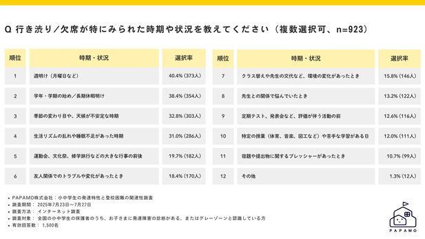 行き渋りや欠席が特に見られた時期・状況を複数回答で聞くと、週明け(月曜日など)が40.4%と最も多く、学年・学期の始め/長期休暇明け(38.4%)、季節の変わり目や天候が不安定な時期(32.8%)、生活リズムの乱れや睡眠不足があった時期(31.0%)、運動会、文化祭、修学旅行などの大きな行事の前後(19.7%)と続きました。