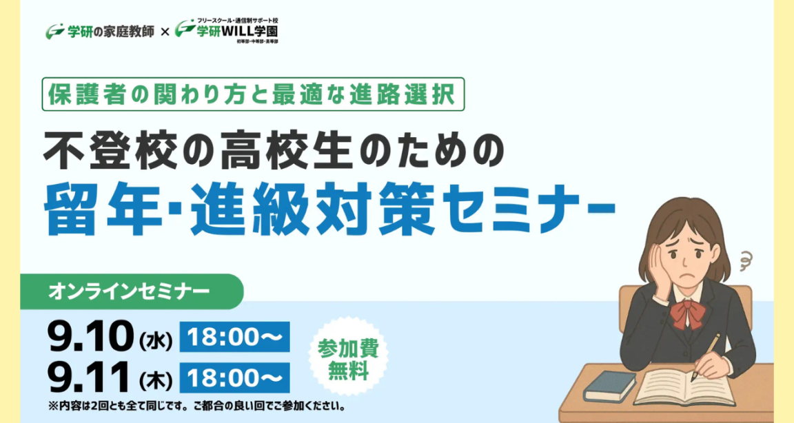株式会社 学研ホールディングス(東京・品川/代表取締役社長:宮原博昭)のグループ会社、株式会社 学研エル・スタッフィング(東京・高田馬場/代表取締役社長:伊藤弘雅)は、展開する「学研WILL学園」「学研の家庭教師訪問支援室」で数多くご相談をいただいている留年・落第への見識を深めていただくため、2025年9月10日(水)、9月11日(木)に「保護者の関わり方と最適な進路選択~不登校の高校生のための留年・進級対策」無料オンラインセミナーを開催いたします。
