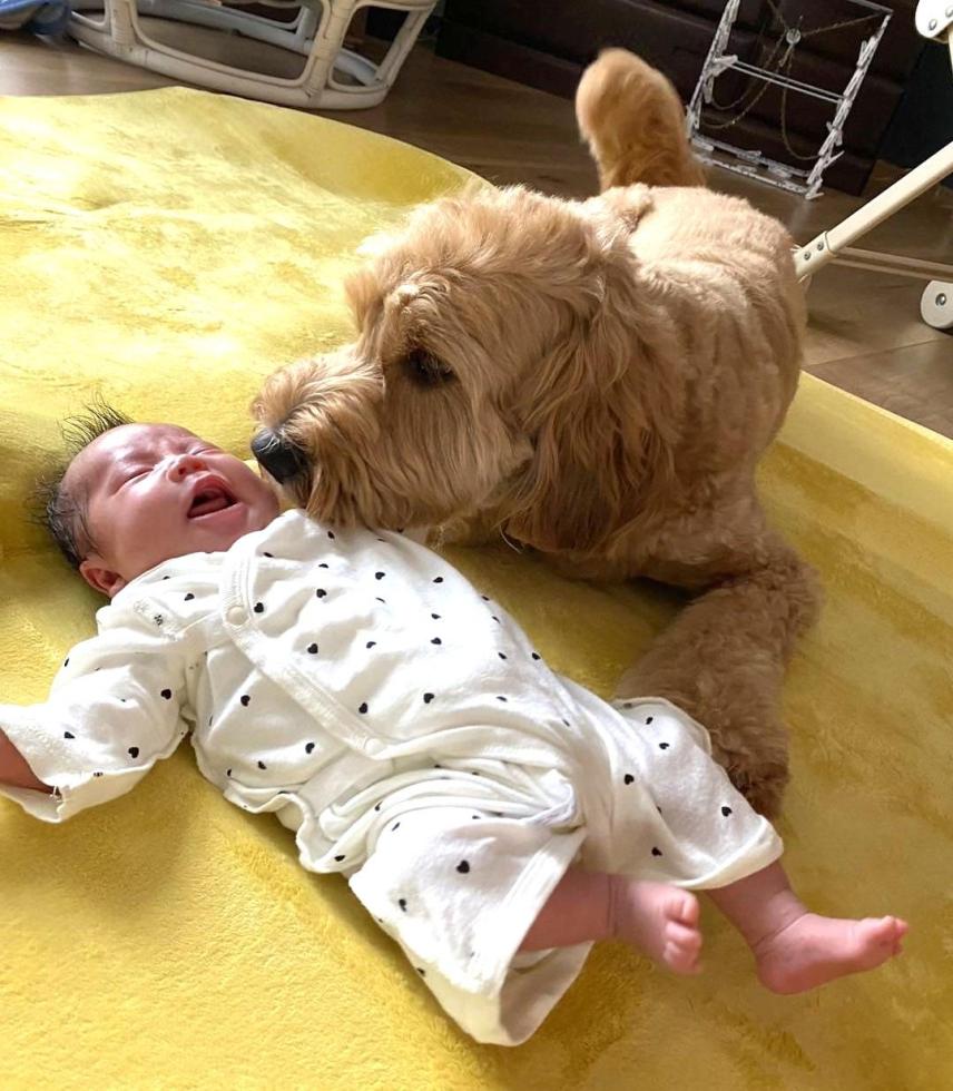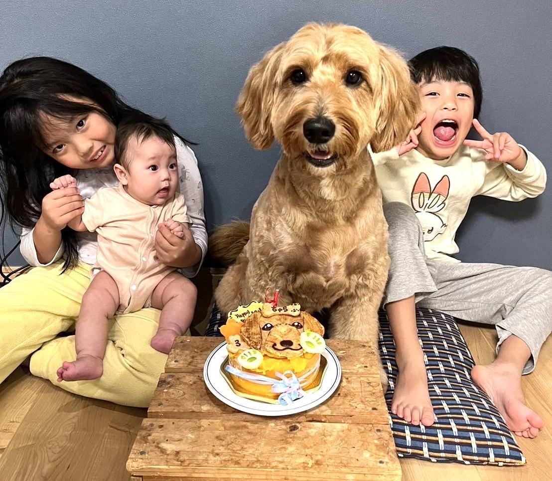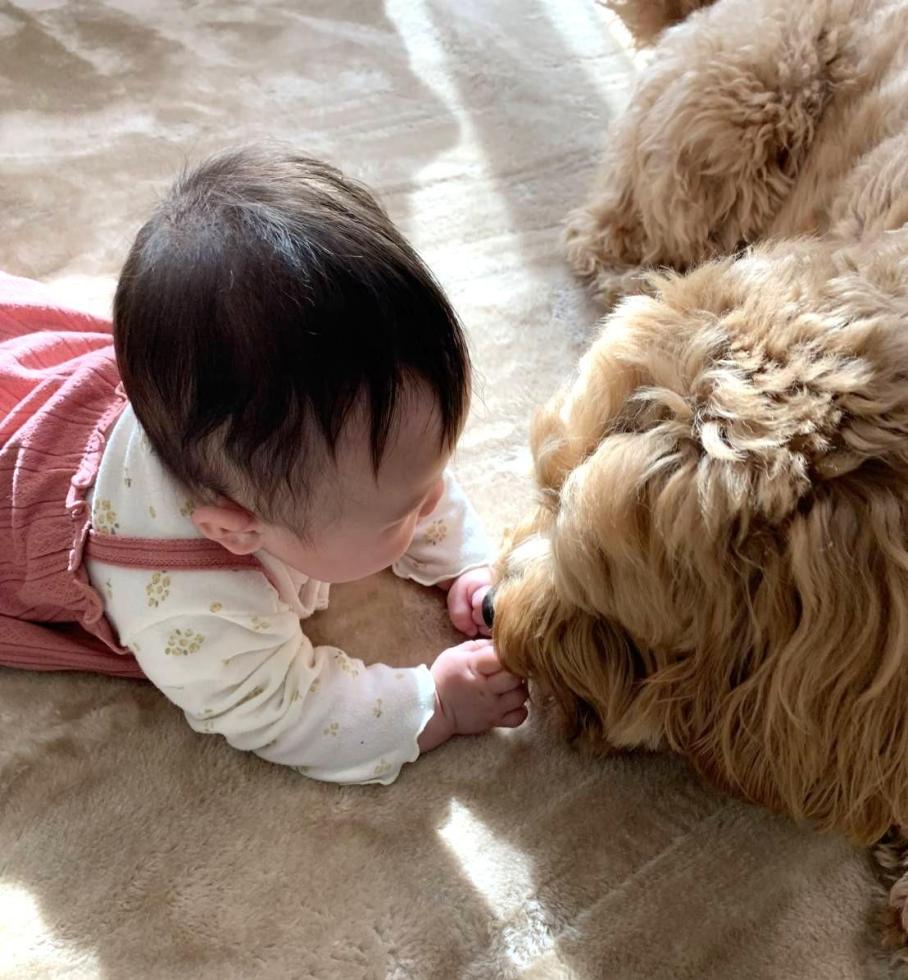 M子さんが妊娠したときは、そのお腹に頭を寄せてじっとしていることがよくありました。「ちゅら」なりになにかを感じていたのでしょう。生まれてからは、赤ちゃんに吠えたのは最初の1日だけ。その後は子守り役としていつも側に寄り添います。