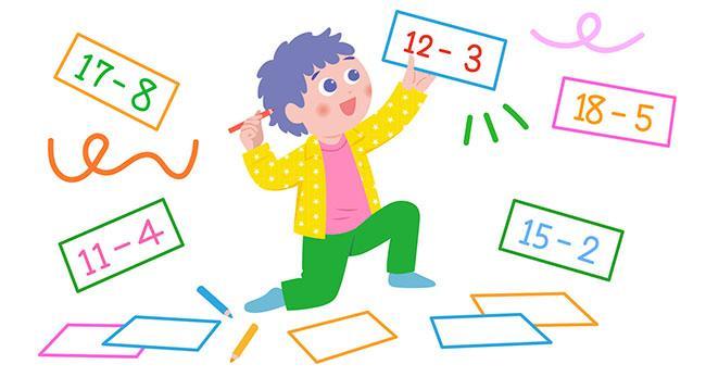 小学1年生のひき算の学習は、まず1けたから1けたをひく計算から始めます。その次の段階は、「10」から1けたをひく計算。この段階では、たすと「10」になる数字の組み合わせをしっかり覚える必要があります。そして、次の段階で、2けた(11~19までの数)から1けたをひく、繰り下がりのあるひき算を学びます。たとえば、「12-3」の場合は、「10」から「3」をひいて「7」、そして残りの「2」と合わせて答えを「9」と出します。