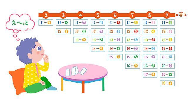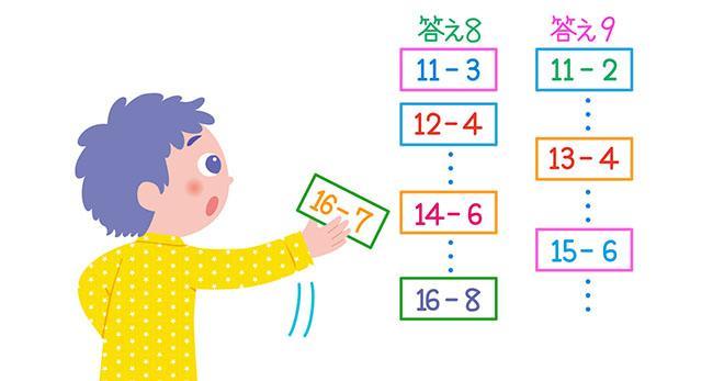 たとえば、答えが「9」のカードは「11-2」、「13-4」、「15-6」などが、答えが「8」のカードは「11-3」、「12-4」、「14-6」、「16-8」などができます。
