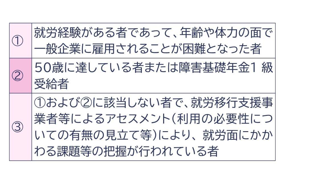 「就労継続支援B型」は、事業所との間に雇用契約は結びません。就労継続支援A型で仕事をすることが難しい障がい者、あるいは年齢・体力などから一般の企業で働くことが難しい方などが対象です。具体的には、以下のいずれかに当てはまることが条件となります。