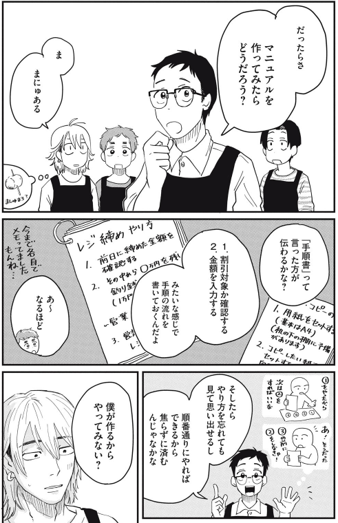 泥ノ田:私自身が小林くんタイプというか、あまり仕事が得意なほうではないので、アルバイトや就職をしていたときの苦い経験を思い返して描いています。メモをしたり、決まった動きをしたりしないと(していても…)作業を忘れてしまうところがあります。だから、学生時代のアルバイトでも、社会に出たときも、なんで自分はこんなにミスばかりをするんだろうってずっと悩んできました。マンガには、小林くんが山田さんというバイト先の先輩に「マニュアルを作ってみたらどうだろう?」と言ってもらうシーンがあるんですけど、あれは私自身の実体験です。