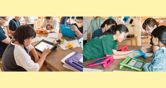 写真は、モデル施設「SORAI SCHOOL」におけるタブレット端末を活用した授業の様子です。