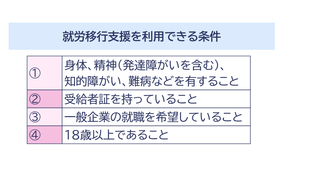 就労移行支援では、主に働くために必要な知識やスキルを習得し、就職(復職)後も職場に定着できるようサポートを受けることができます。サービスを利用するためには、以下の条件を満たす必要があります。