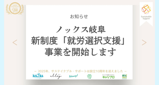 一般社団法人サステイナブル・サポート(所在地:岐阜県岐阜市)は、2025年10月1日より、新たに創設された障害福祉サービス「就労選択支援事業」を開始いたしました。実施事業所である「就労移行支援事業所ノックス岐阜」は、本年7月に設立10周年を迎え、これまで支援を通じて多くの就職実績を重ねてまいりました。