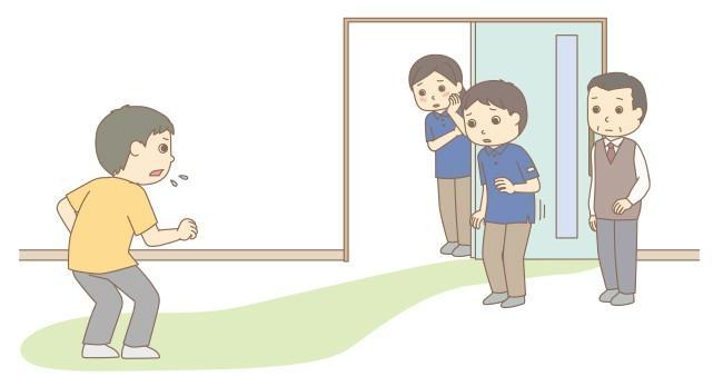 Tさん(男性・20代・自閉スペクトラム症)は、入所施設で共に暮らす方が近づくと、噛みついたり押したりする行動が見られたため、ロビーでの活動に参加できませんでした。自由時間は、一番奥にある居室のベッドの上に座って過ごしてもらっていました。すると、居室の入り口やベッドのまわりに見えないバリアを張り、食事以外で移動することを拒むようになりました。さらに、バリアに人が侵入すると攻撃するようにもなってしまいました。