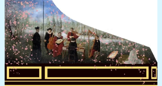 ▲ 施設に常設するチェンバロの装飾(画:馬淵哲)。天正遣欧少年使節団が西洋音楽を日本に初めて紹介した歴史的な場面が描かれています。右端には豊臣秀吉の姿も見えます。かつて彼らが新しい文化の扉を開いたように、この場所から、これまでにない新しい芸術や面白い取り組みが次々と生まれてほしいと願っています。