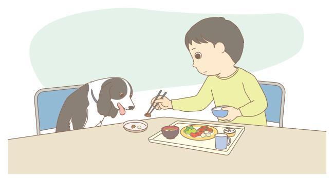 床に寝そべるジェシカを、しっぽ側から楽しそうになでるようになったころから、食堂ではなく、スタッフの部屋でごはんを一緒に食べることにしました。この特別な時間と場所は早食いがしづらい環境でしたが、Kさんのお気に入りとなりました。