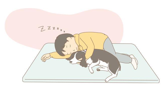 Kさんはジェシカのにおいを嗅ぎながら、顔をうずめるように寝転がります。寝ているジェシカを枕のように敷くのですが、腕枕で頭を上手に浮かせて力をかけていないようです。ジェシカは逃げずに普通に寝ています。これは他者に配慮した行動と受け取ることができます。