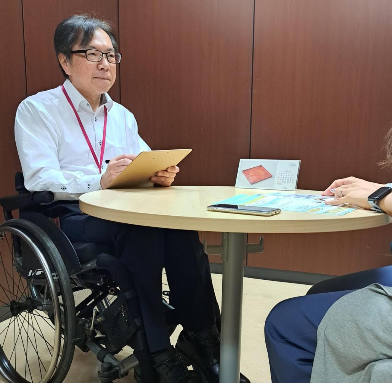 ▲就労支援業務として、障がいのある方の就労をサポートする面談を実施している。アビリティーズジャスコ株式会社では、障がいのある社員が障がいのある方を支援している