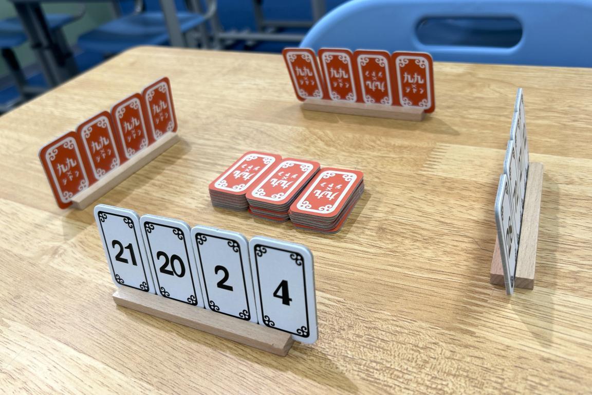 左の数字カードをめくって「8」が出たら、右の九九カードをめくります。「4×8(しはさんじゅうに)」のカードがあけられたら、数字カードと九九カードを取ることができます。これは、子どもが九九カードを探し始める前に、「4×8(しはさんじゅうに)」と宣言すること、そして、もし違うカードをめくってしまっても、その九九を唱えさせることで、九九の定着をうながすことができます。