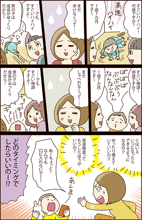 1歳7カ月ですがまだ歩かず、ことばということばも出ない息子です。決しておとなしいわけではなく、喃語は出ていてとても速いハイハイで力強く移動もしています。「男の子は成長がゆっくりだ」という話はよく聞くのでゆったりと構えていればそのうち立って歩けたりことばも自然と出てきたりするものなのなのでしょうか? また何でも口に入れてしまうのも少し気になっています。発達検査をするべきなのでしょうか?