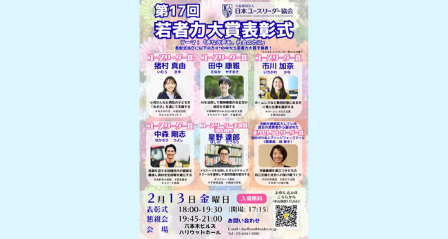 表彰式は、2026年2月13日(金)に六本木ヒルズ ハリウッドプラザ「ハリウッドホール」にて開催されます 。なお、今回選出された「ユースリーダー賞」受賞者5名の中から、最優秀賞にあたる「若者力大賞」が表彰式当日に選出される予定です。