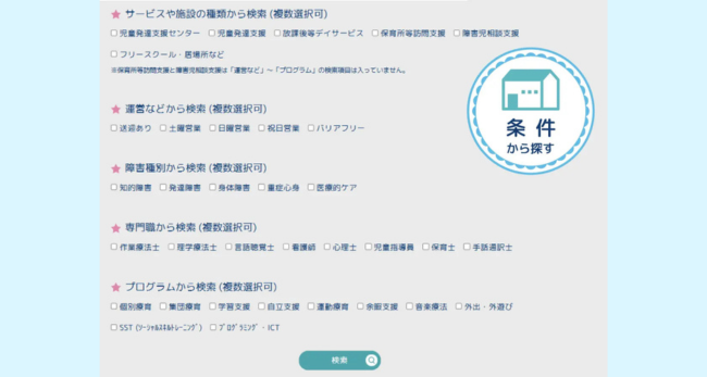 ▲条件を入力して検索することで、よりお子さんやご家庭に合った支援先が探せる