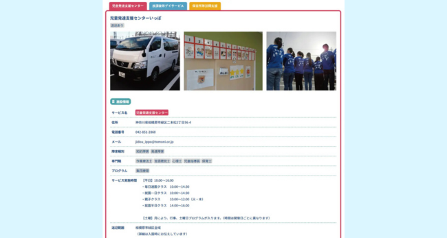 各事業所ページでは、サービス種別や所在地といった基本情報に加え、施設ごとの特色や支援への想いが伝わる情報を掲載。