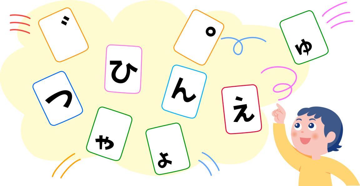 さらに、拗音(小さな「ゃ」、「ゅ」、「ょ」)の文字をカードに加えていきましょう! さらに、文字をひらがなからカタカナにかえて出題することで、長音記号「ー」(伸ばし棒)を加えて楽しむこともできます。