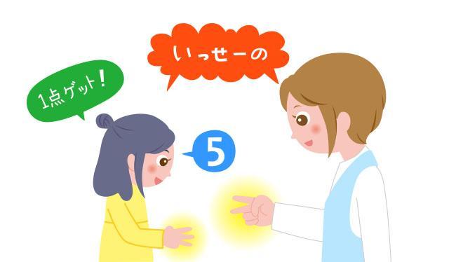 この「指スマ」を少し変えたゲームを親子2人でやってみましょう。お互いに片手を握って前につき出します。そして親子で順番に「いっせーの“5”(1から10までの数字なんでもよい)」のかけ声とともに数字を言い、2人同時に親指以外も含めた0~5本までの指を出します。指の数の合計とピッタリの数字を言えたら1点ゲット! というルールにしましょう。何回か繰り返して、目標点数を5点や10点として、親子でゲームを楽しみます。10までの数の合成と分解が遊びながら身についていきます。