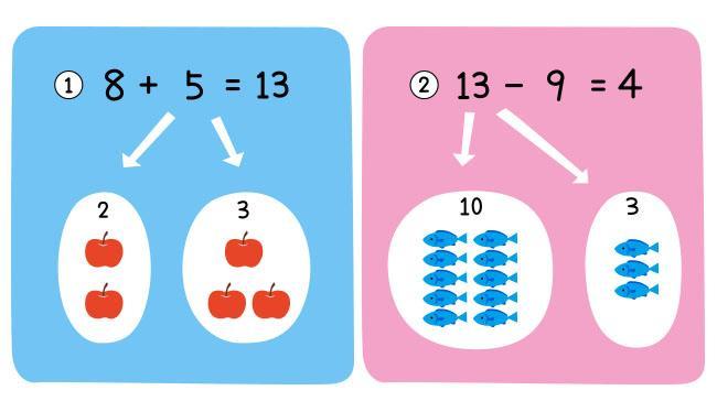 合成と分解は、「『1けたの数+1けたの数』で答えが10をこえるたし算」、そして「『2けたで10の位が1の数-1けたの数』で答えが1けたの数になるひき算」の学習で役に立ちます。下の計算をご覧いただくと、合成と分解が不可欠であることがわかっていただけると思います。